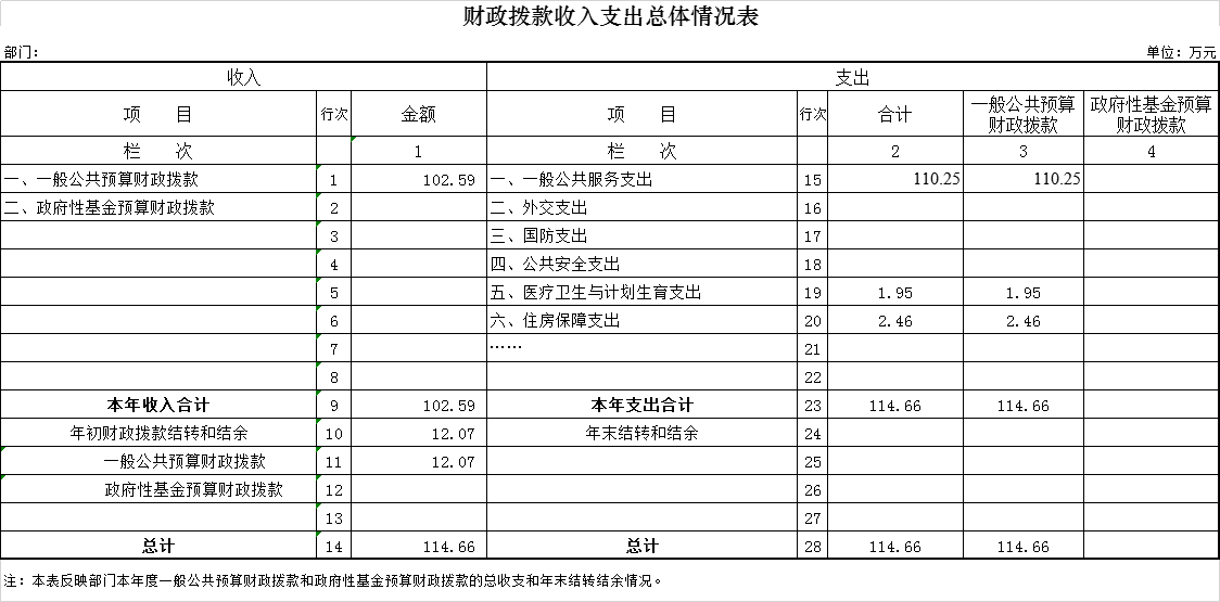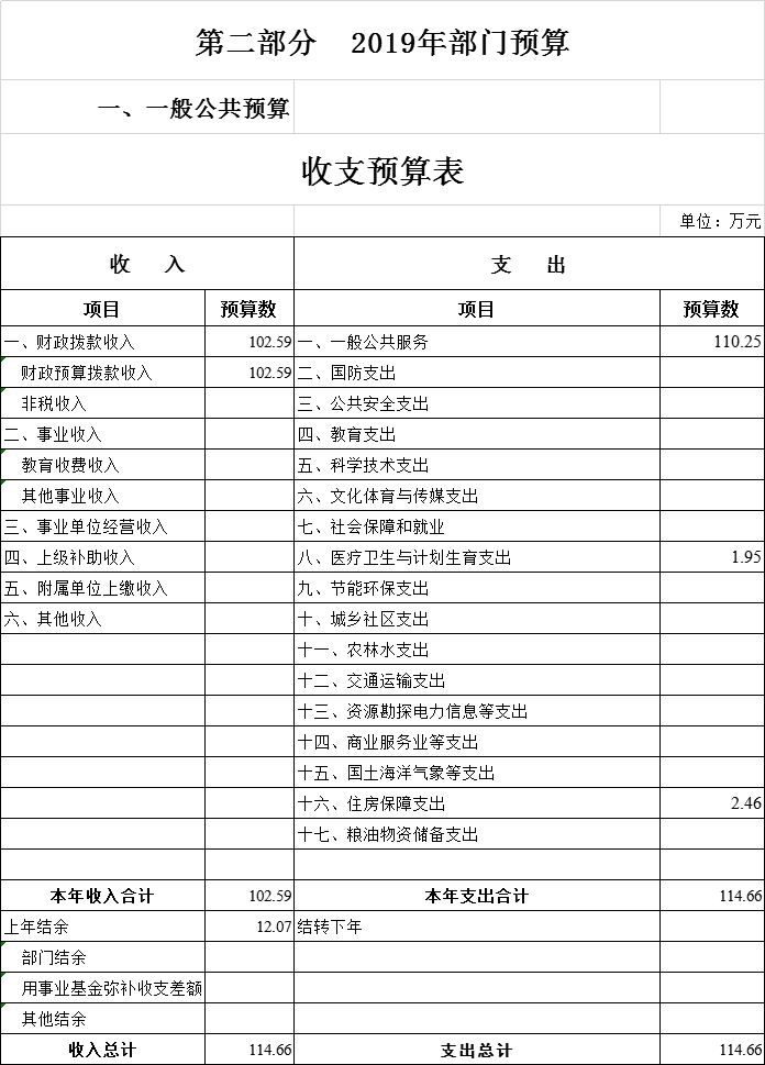 按照部门决算与部门预算相衔接的原则,预算编制内容包括预算单位的全部收支情况。收入包括:财政拨款收入、上级补助收入、事业收入、经营收入、附属单位上缴收入、其他收入、用事业基金弥补收支差额、年初结转和结余;支出包括:一般公共服务支出、教育支出、科学技术支出、文化体育与传媒支出、社会保障和就业支出、农林水支出、住房保障支出、结余分配、年末结转和结余。2019年收入总计 114.66万元,支出总计114.66万元,与2018年相比,收、支总计各增加34.43万元,增长42.91%。主要原因:本年度项目支出增加。