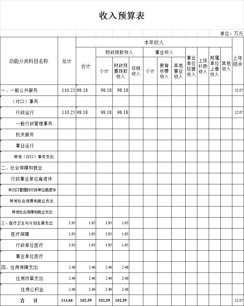 本年收入合计102.59万元,其中:财政拨款收入102.59万元,占100%;上级补助收入0万元,占0%;事业收入0万元,占0%;经营收入0万元,占0%;附属单位上缴收入0万元,占0%;其他收入0