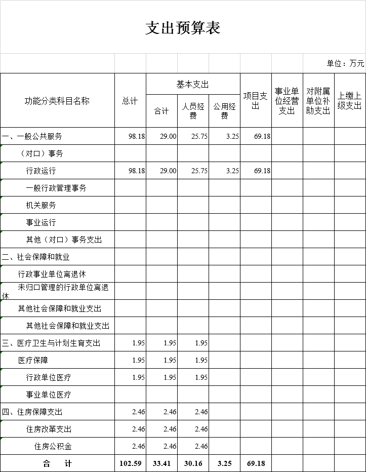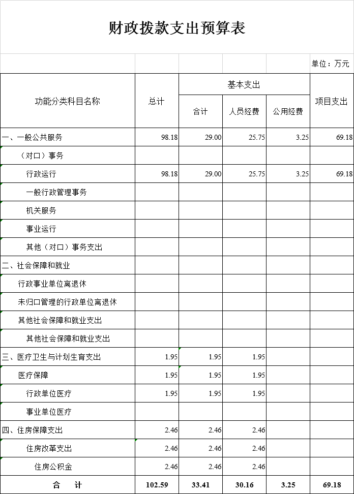 本年支出合计102.59万元,其中:基本支出33.41万元,占32.57%;项目支出69.18万元,占67.43%;上缴上级支出0万元,占0%;经营支出0万元,占0%;对附属单位补助支出0万元,占0%。基本支出中,人员经费30.16万元,占90.27%;公用经费3.25万元,占9.73%。