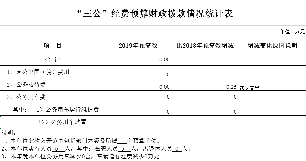 2019年“三公”经费财政拨款支出预算数比2018年增减少0.25万元,降低100%。其中:因公出国(境)费支出减少0万元,降低0%;公务用车购置及运行费支出减少0万元,降低0%;公务接待费支出减少0.25万元,降低100%。主要原因本年度减少开支。